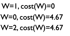 이 공식을 토대로 W를 임의의 수를 지정하고 data set을 가지고 대입하여 그래프를 그려보겠습니다.